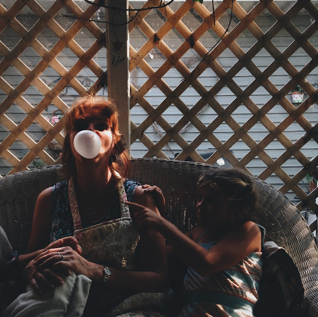 We spent the morning visiting a local Anglican Church, where I promptly messed up communion and fumbled through the liturgy, enjoying it's comforts and beauty all the same. Then, happily sitting on the back porch, while the afternoon light waned, with a new knit in hand, while the kids learn to blow bubbles with their gum, something I have been working with them on for year, but leave it to Grandma to teach them in minutes.